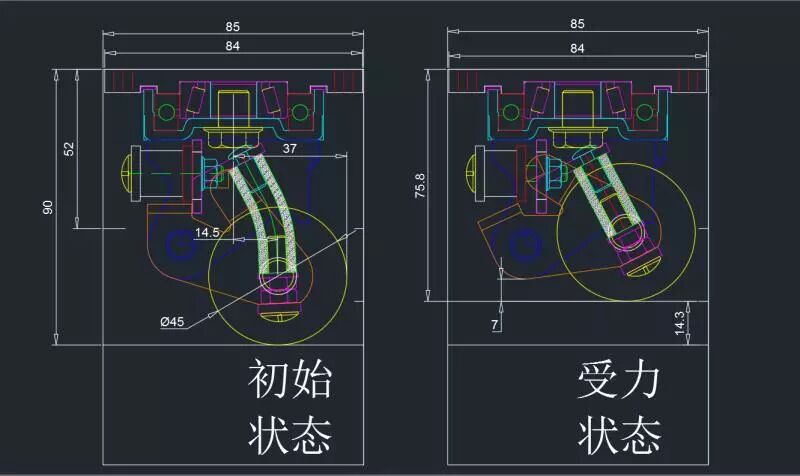 通过弹簧和硬减震模块,为脚轮提供减震,确保几个轮子都在一个平面上,但脚轮首次负重10-15kg(预警力可调节至10-50/kg),脚轮高度会降到78mm左右,当负重进一步加大或经过不平整地面时,二级减震硬减震行程2-3mm,限位高度降低76mm左右